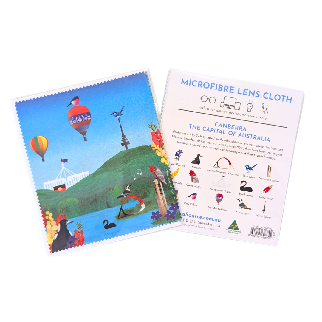 Our gorgeous ‘Canberra’ Microfibre Lens Cloths are vibrant in colour and celebrate the Capital city of Australia - Canberra. The backing card includes the names of the sites including the National Museum of Australia, Parliament House and Telstra tower amongst the native flora and favourite birds such as the gang gangs and magpies.