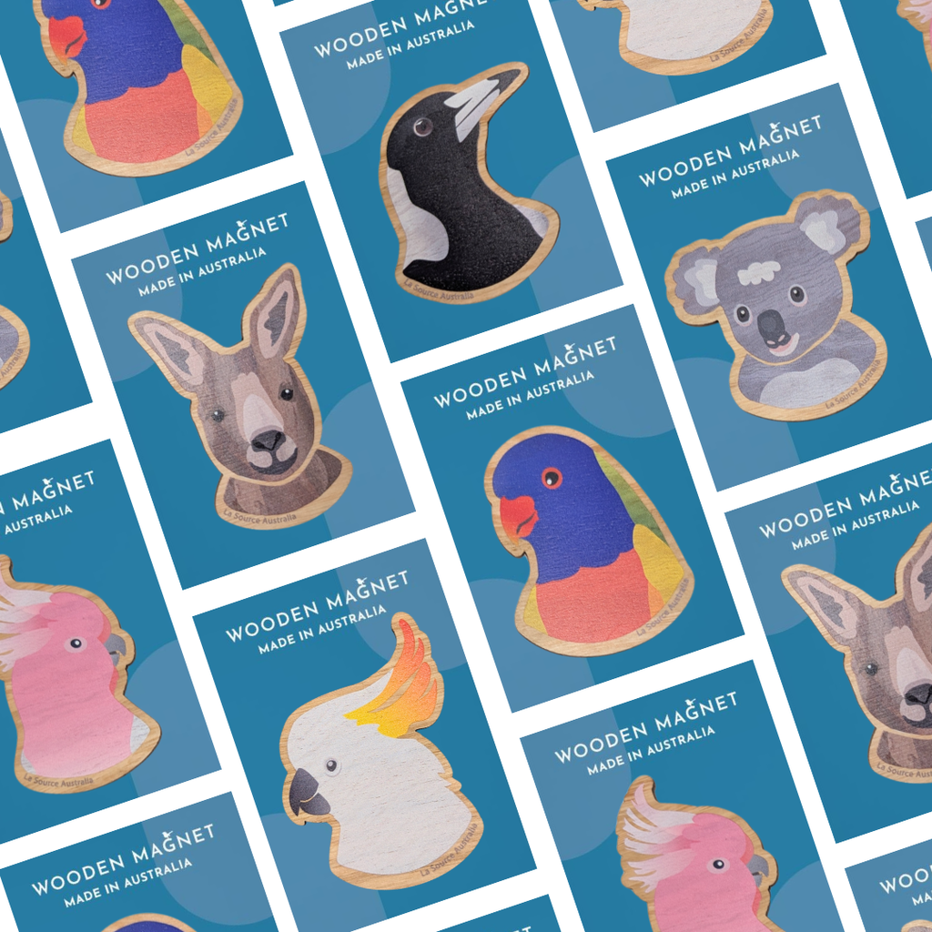 Celebrate Australia’s feathered and furry friends with our charming Animal Wooden Magnets. 100% designed and made in Australia on sustainable eucalyptus wood, each magnet showcases our original artwork, bringing a touch of nature into any space.